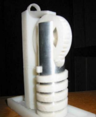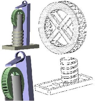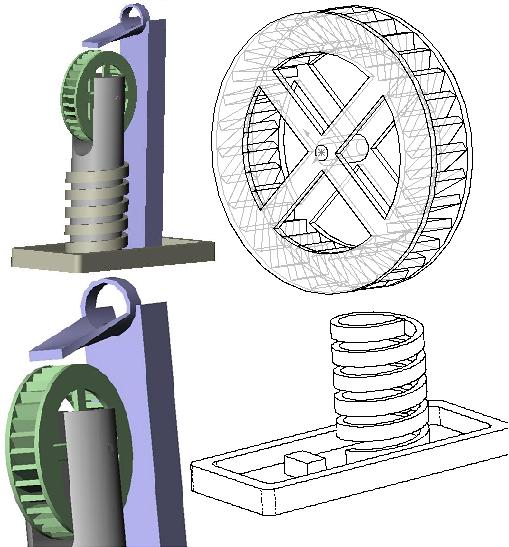 rotary motion As far as the rotary motion powered by a fluid, I have designed a really nifty watermill. Old-fashioned in purpose and use, but made with modern manufacturing techniques and a more artistic than functional bent. At left is a thumbnail of the CAD - a larger image is available by clicking on it.