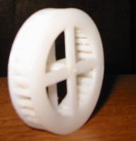 design aspects The printed base is designed to hold a small amount of water which can be cycled through the system with a small pump (~$20 at hardware store) run by a drill. The axle, stays up by friction against the sides of the nc milled/lathed stand, which is shaped like a tuning fork. My aim in using this shape was to get the rotation to create vibration in the tines, thus making noise as the water ran through the system. It also allowed me the chance to see the differences between using nc machining and manual instruction to make similar shapes (this one is taller and fatter than the fork made in class). The blades are placed close together, curved and at an angle, as they are in real mills. This makes them more efficient by preventing the loss of water straight through the wheel. The flume that drops the water is about 7° off from vertical. In real mills, efficiency is optimized at 10° from vertical. |