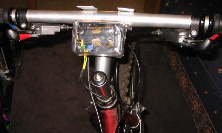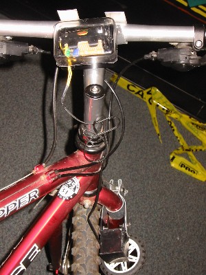 functions It seems to work, as I've been able to get enough to play a walkman for at least a few minutes - didn't want to run down my first success =). Although I have yet to make the charge indicator glow exclusively under bicycle power, it works when tested on a wall wart and when charging a nearly full battery. improvements As it is, the system is very inefficient, and it would take a long time to fully charge a battery. This can be improved with the use of a more appropriate motor, lower friction between the motor and bicycle wheels, and improved placement of the motor. The design of the casings can be improved to be more durable, steadfastly attached, and able to deal with mud, rocks, and other spray and dirt. Sporadic contact with the wheel is also a problem, although this might be a more difficult one to overcome, a balance between high friction and lost contact. |