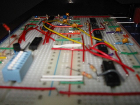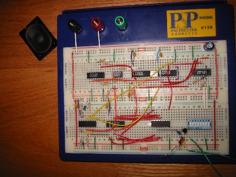 Wow. It's a circuit. The pseudo-random noise generator (schematic) uses several chips and some other wiring to make, well, random sounds. Add a few flashing LEDs and make it room-sized for a perfect computer from a B sci-fi movie several decades back. It works pretty slick, although a bit staticky, a reasonable introduction to following circuits. A one minute sample can be found here in mp3 or wav format. |