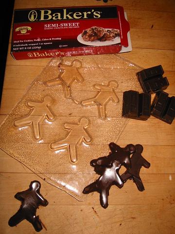 hot wheels The package I made is for a Hot Wheels 99 Mustang model car about 3 x 1.25 x 0.75 inches. In order to make the blister pack, I molded the car on top of a Tupperware® lid. The reverse side is made from the other side of the lid. They mate okay without adhesive, but for better adhesion I used a bit of hot glue. Label photoshopped. chocolate men Using the laser cutter, I made four acrylic gingerbread men 2.5 inches tall and 1/8" deep. I vacuum formed them on a single sheet to make a chocolate mold. Another people part I formed was a fingertip used on the readbwrite, which was made from a clay model of my own finger.