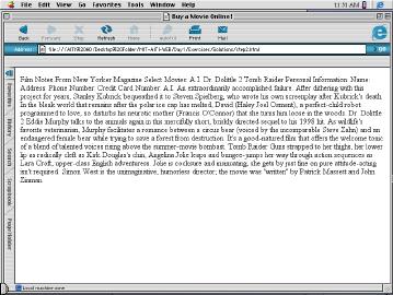 Now that you have downloaded the two files to the disk, you should start editing "movie.html." Open "movie.html" in NotePad. NotePad is a simple text-editor that you'll be using to create the webpages in this class. After you open "movie.html", you'll notice that the file contains some raw text that over the course of the exercise you'll be changing into a webpage. Each time you edit "movie.html", be sure to save your changes. Then open (or reload) the file movie.html within Internet Explorer to see the results of your changes.