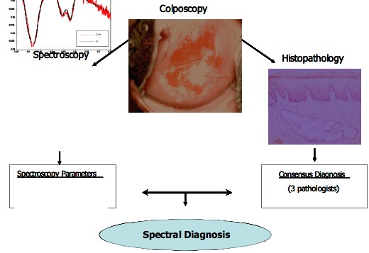 Each biopsy specimen underwent standard histopathological processing. The hematoxylin and eosin stained tissue sections were evaluated by three experienced pathologists using standard diagnostic criteria. We used consensus diagnosis (agreement of two of the three pathologists) to determine the disease diagnosis of the study samples. Each biopsied site was classified as either negative for SIL, LSIL or HSIL. The spectroscopic parameters of each site were extracted by using DRS and IFS analysis, and were correlated to histopathology diagnosis. The spectral diagnostic algorithm was developed by using logistic regression models based on a combination of significant spectroscopic parameters providing the most important diagnostic information. The schematic represenation of the study design is shown in Figure 1.