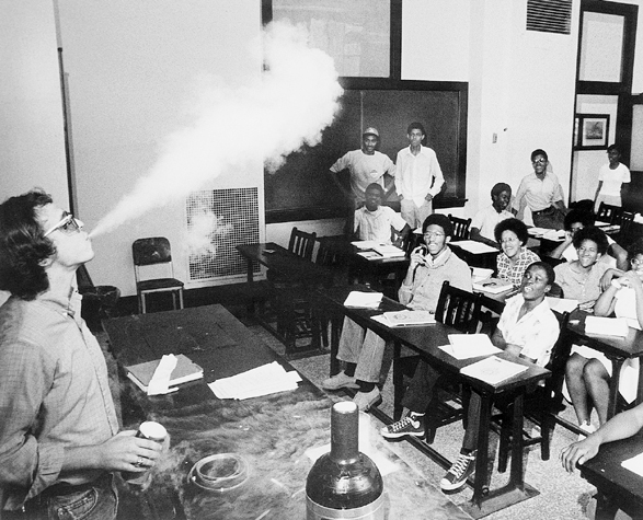 Chemistry instructor John Cross delights Project Interphase students with a demonstration, 1974.