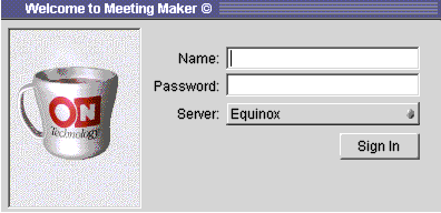 Name:field and enter your Meeting Maker sign in name. This is the same name that you use to sign in to your regular Meeting Maker client.- If you have a password to Meeting Maker, enter the same password in the