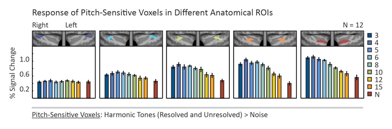 From each ROI, we selected the 10% of voxels that with the most significant response preference for harmonic tones compared with noise. The figure plots the response of these voxels, measured in independent data, to all of the harmonic and noise condition, collapsing across the two frequency ranges tested (as in Figure 3B). The 4 most anterior ROIs contained voxels with a replicable pitch response, responding more to tones than noise in left-out data. The most posterior ROI contained no replicable pitch responses, even though it contained an equal number of sound-responsive voxels (see Figures 4D-F). All ROIs with a replicable pitch response also responded more to low-numbered resolved harmonics.
