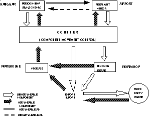 All components that comes from or goes into the aircraft because of scheduled or unscheduled removal/installation, gets through the counter or component movement control (CMC) to be recorded into the computer. Aircraft registration, part number, serial number on/off are the main information that has to be conveyed by the mechanic to the counter in order to put it into the computer. Counter will sent the unserviceable component to the workshop for repair or to the export division if the own workshop has no capability for repair. Workshop will sent all serviceable component back to warehouse or to third party if it encounters problems in repairing it.