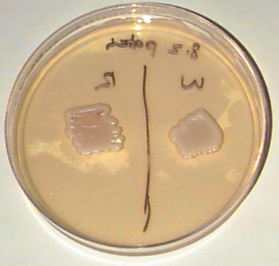 A dense sample of cells from the red region of the plate in figure 1 was smeared on a roughly square patch on the left-hand side of the plate below. The cells in that region were roughly as dense as at the start of the original patch (figure 1) - a dense, but barely-visible smear. A similar sample from the white region of the plate in figure 1 was smeared on the right side of this plate. This plate was incubated for 5 days at 30C.