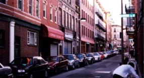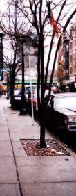 Hanover St. only fares a little better in regards to all things natural. The street itself is much wider than Salem, permitting two-way traffic, parking on both sides of the street, and adequate sidewalk space. Here, there is even enough room for the occasional tree, spaced approximately 6 trees per block. This small number of trees is not nearly sufficient to provide the benefits described in Anne Whiston Spirn's book, The Granite Garden, such as significant shading, absorption of air pollutants, and decreased energy demands. (Spirn, 183) During the spring , summer, and early fall, they do provide for a more aesthetically pleasing streetscape however.