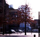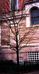 The trees in the brick patio in the playground grow much taller than those on the street and have denser branches. One of the trees in the gated garden; it is smaller than those in the patio because it is in the shade more often. next