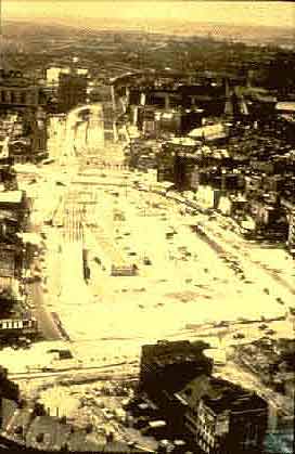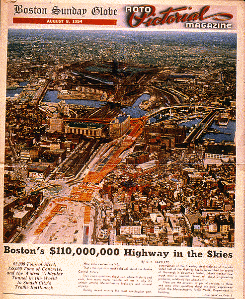 The construction of the Central Artery had the biggest impact on the North End than any other construction in the 20th century. The master plan for the Central Artery was finished in 1948, calling for a major elevated highway through downtown Boston to carry local traffic. Construction started in 1950, and in 1954 , the Central Artery opened for uses, cutting off the North End from the rest of downtown Boston. Over 20,000 people were displaced and 1000 buildings were destroyed.A view of the land cleared to make way for the Central Artery. The North End is to the right in this picture.