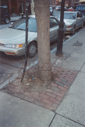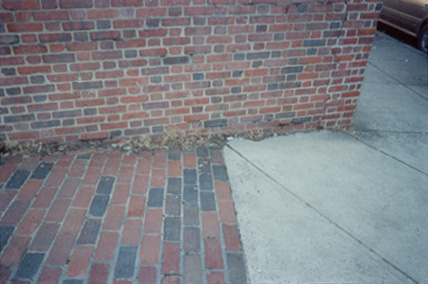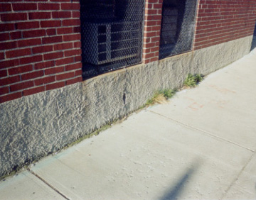Parking lots are another place where the affects of natural processes are very apparent. On Fleet Street, there is a parking lot that shows many of these signs. The cement wall of a house bordering the parking lot has been chipped away in one area, exposing red bricks underneath. Probably, a cement layer was poured over the bricks to further reinforce the house. In the back of the parking lot, there is a single, bare tree that has somehow grown up between the cement wall of a bordering house and the thick blacktop of the parking lot. The blacktop at the base of the tree has been pushed upwards and is cracked at the edges, as if the tree forced its way up. It is the only tree in the whole parking lot. However, there are other, smaller plants that have grown up in the cracks between the cement sidewalk and the blacktop.