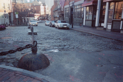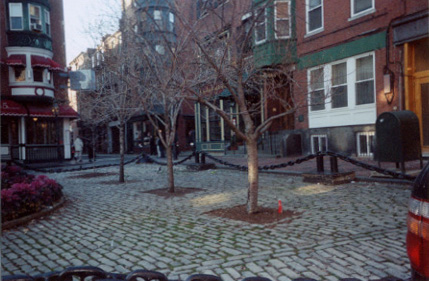In another park, North Square, the affects of natural processes can be easily seen. The park is covered with cobblestones, although there are patches of sand, mud, and blacktop scattered about. Moss grows between the cobblestones and water collects in the low spots. The street surrounding North Square is also made of cobblestones. It dips up and down in many areas, most likely caused by the passage of carriages and automobiles. Also, the park is surrounded by large iron links, which are now heavily rusted. At the tip of the park, there is a fenced-in area of soil. Both the fence and the posts surrounding this small area are full of rust. In the center of the dirt and mulch there is a large tree with several smaller plants growing up around it. There appears to be an old telephone in this area. It is heavily rusted and full of peeling old paint. All of these parks have been changed over the years and continue to be changed by natural processes. This has seriously affected the shape and appearance of my site.