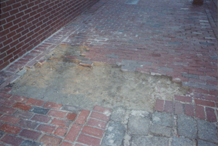 On the corner of Richmond Street and Atlantic Avenue, the sidewalk is brick and mortar. The land is not level and the bricks have been cracked in many areas where the ground changes in elevation. There is soil and mud between the cracks in the sidewalk. However, there is no plant growth in the soil.