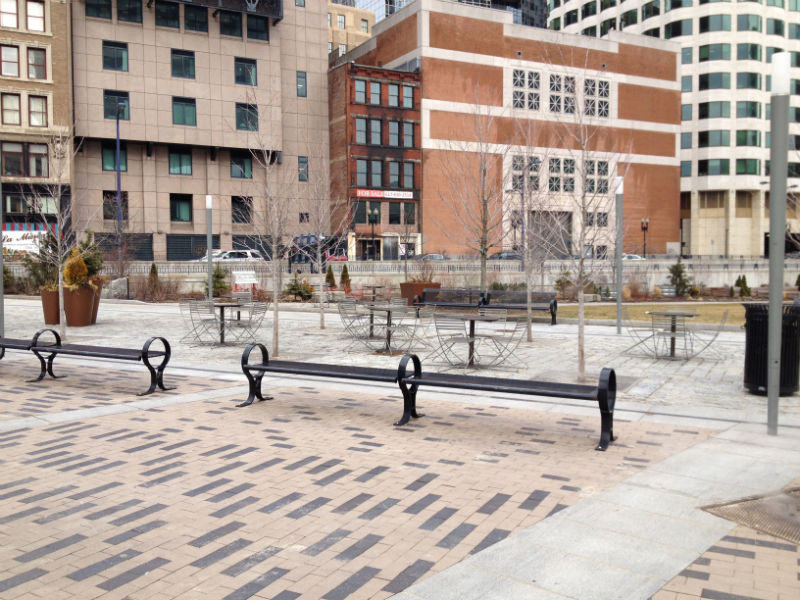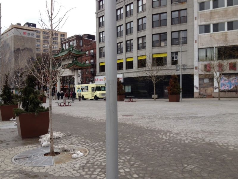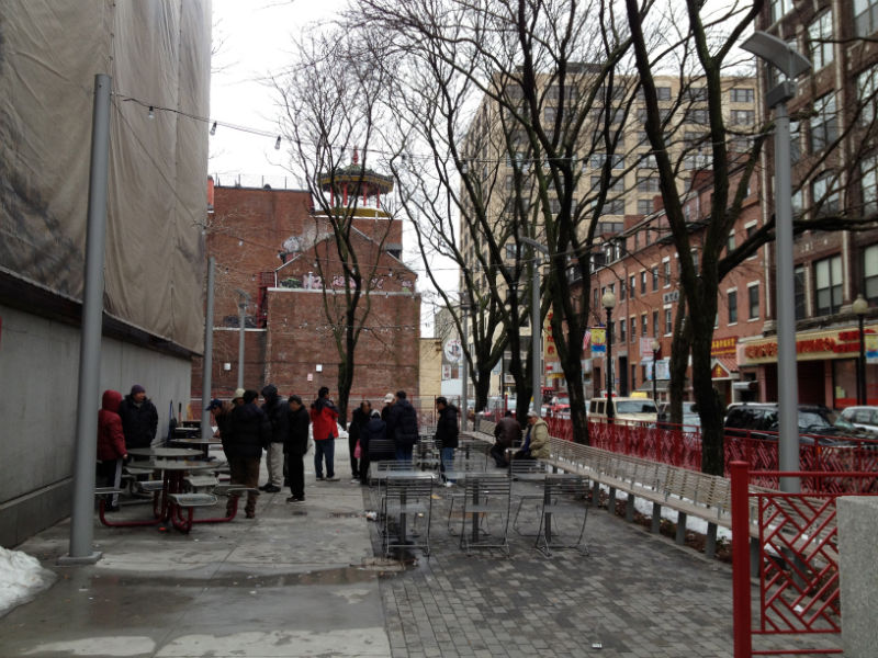 A small plot of trees separates it from the I-90. Behind this vent lies a small rectangular courtyard, known to locals as the Mary Soo Hoo or Chinatown Gateway Park. This vent serves an effective shield that prevents the park from being directly adjacent to the road, a location that Spirn describes as being known to contain up to 16 times more lead in its atmosphere than the normal level. It is not hard to imagine this structure offering relief from the sun to visitors of the park during summer, turning it into a “shady haven”. Even on a cold winter day, numerous residents of Chinatown gather to play Chinese checkers in this area, shielded from the easterly wind coming from Fort Point Channel by this vent.
