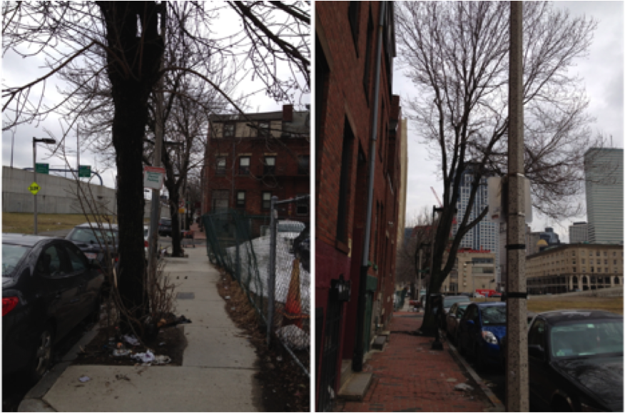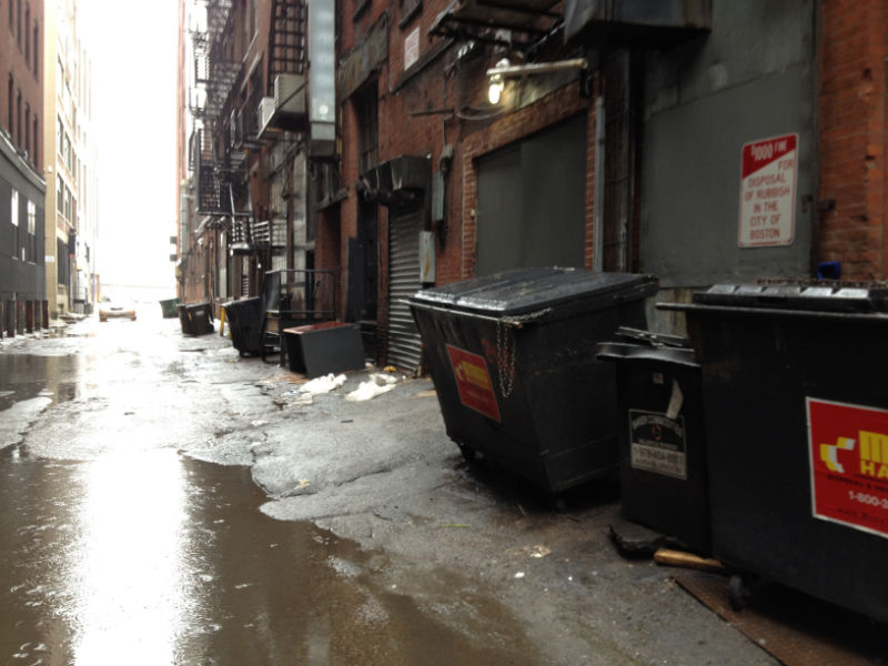 In The Granite Garden, Spirn elucidates on page 99: “ground subsidence is usually a direct effect of human activities – the pumping of gas, oil and groundwater…building on unconsolidated landfill”. She also mention on page 100: “garbage, rubble, and the wood of old wharves and sunken boats decompose at different rates and may cause subsidence for many years.” The above image seems to show that the middle region of the alleyway is sinking, with the road sloping down from where it borders the buildings flanking it on both sides (the dumpsters are clearly on an incline). This creates a cavity where water can pool up to not only cause inconvenience to people seeking to travel through or park their car, but also potentially erode the paved road and hasten its degradation. Water is more likely to build up on natural surfaces as well, as compacted soils slow down infiltration and drainage. The street trees growing in compacted soil in the Leather district must thus deal with being water logged and oxygen deprived. Thus, in these instances where urban forms have not been constructed with nature in mind, they have been ravaged and undermined by natural processes.