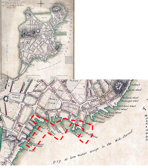 The environment of this site has been shaped by man’s influence since the beginning of its existence. When Boston’s first settlers arrived in 1630, most of this area did not exist –in its place were marshland and open water. Shown here is a map depicting Boston as it was in 1775, a mere fraction of the peninsula it is today. The approximate location of my site is marked on the zoomed in portion of the map by the red dotted line.