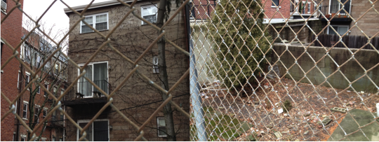 Now, a large expanse of open grassland neighbors the highway, sloping upwards to meet the elevated structure, as shown in the image above. The lack of tall buildings surrounding this highway has prevented a ‘downtown canyon’ where air pollution can be trapped in inversions, as described in The Granite Garden, from being created. However, although the field itself is barren, its bordering Hudson Street is dotted with tall, sturdy trees growing out of small plots. These trees grow in front of brick houses displaying “keep out of private property” signs, and show no signs of being regularly attended to by local residents. The leftmost image below shows the base of one such tree strewn with trash.