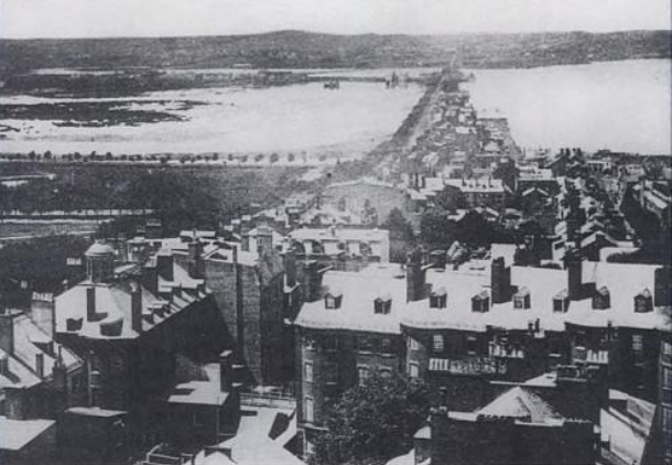 Boston grew significantly from the early 1800s to the early 1900s and therefore it expanded its borders to new areas. The First Church of Christ Scientist land area, located on the Back Bay, went through the faces of becoming a new plot of land, to suburb of Boston, and finally to a part of Boston. In the mid-1800s the expansion pushed Boston’s borders towards the south and west. The figure below shows the 1858 view of the Back Bay from Boston; it can be seen that the land has not been filled. The land filling was finished around the late 1880s and early 1890s. This was all new land ready for new buildings and roads.