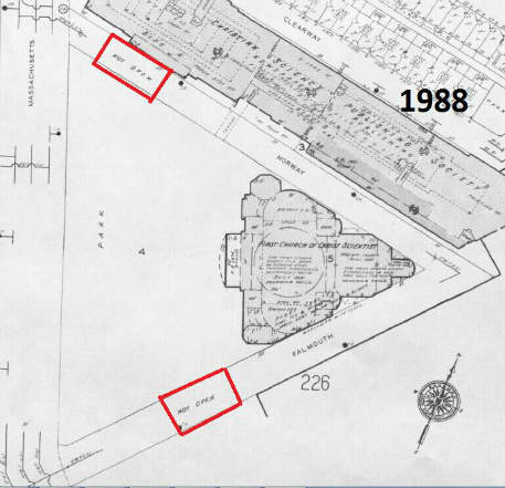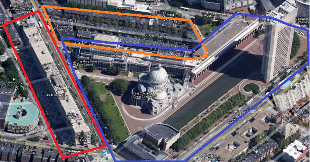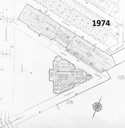 The site now has also gone through some changes, but once again, the trend of turning into part of Boston has continued. Housing was taken down to expand the Church even more. The church even took over the neighboring streets and closed them down. Other maps show that the circulation of these streets was stopped by the church sometime between 1974 and 1988. The church has “recently” built a reflecting pool and several other buildings next to it. This means that the church is still very strong and very powerful. This First Church of Christ Scientist is the “mother church so it is very important to this worldwide religion. The other housing and commercial areas have remained the same. There are still commercial areas in the west side of the site and there are still some housing areas in the northern part. Now, because the apartments are located between some very distinct and big buildings, the apartments are the ones that seem out of place. The Church now takes up a huge chunk of the center of the site.