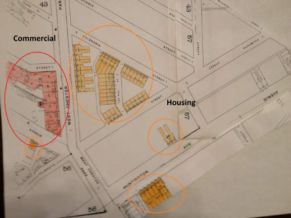 Another big change is that some of the apartments that were located on the southern part of the site have also been torn down in order to make a park. This park takes up most of the space of the lot but not all of it. Kenneth Jackson explains how, “The suburban dream demanded an enlargement of open areas”. He goes on to explain how rural commentaries, suburban cottages, and in our case parks were “advocated for the benefit of ‘aesthetic and moral nature’ as well as physical health” (55). The creation of the park was just one step closer to becoming a part of Boston. The left third of the lot is for commercial use. Here you will find the Uptown Theater, and the Exhibition hall. To the south of this lot, you will find that some of the apartments have also been torn down to make way for other buildings. In this southern lot, there is a line of apartments, but with some different buildings too. There is bank, a hotel, and a doctor’s office scattered in these buildings. The buildings look just like the apartment buildings from the map but they are not used for housing. This could be because most of the land is already taken and so the owners had to buy a building that was already built; the easiest types of buildings to take over would be apartments, I think.