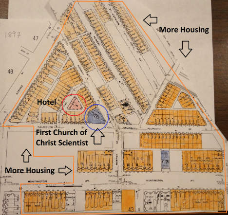 During the forty years since 1897, there have been more major changes to the site. The most obvious and important change is the expansion of The First Church of Christ Scientist. The church used to take up only the small corner of land, and by 1937 has taken up most of the triangle shaped lot, and the whole lot of land that is just across the street to the north of it. The size of the church has increased dramatically; it is quite impressive. Not only were the apartments demolished, but also the hotel that was located in the between all the apartments. The demolition expand the borders of the church, which is now a very powerful and very grandiose church. The plot of land that is to the north of the central building of the church has now turned into the Christian Science Publishing Society (i.e. a newspaper publisher headquarters). The building located to the west of the central Church building was turned into the Christian Science Administration Building. These buildings belong to the church which suggests that the church has gained a lot of money over the years. This obviously means that this religion has also increased dramatically in this area over the years. The fact that the church was able to tear down apartments and a hotel to make room for more buildings is very extraordinary. The apartments that run along Mass Ave. still remain at this time. If I had not known what the church looks like today, I would have never guessed that the church was going to expand so much. There have been additional apartments on the new neighborhoods to the north of the Christian Science Publishing Society building. The New England telephone and telegraph company has been built in this neighborhood. A reason for why this company is so far from the others on the site is that there might be another commercial/industrial site to the north of that. There are four huge rows of housing. It appears that the housing land has shifted from the central part (triangle shaped lot) to the northern part of the site.