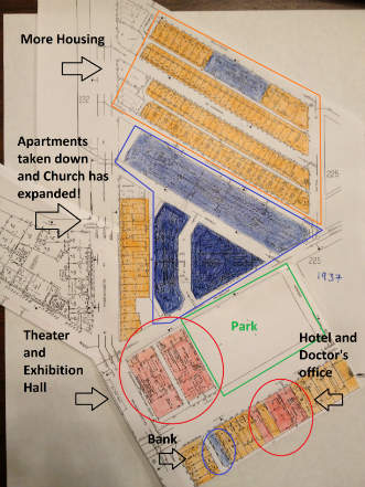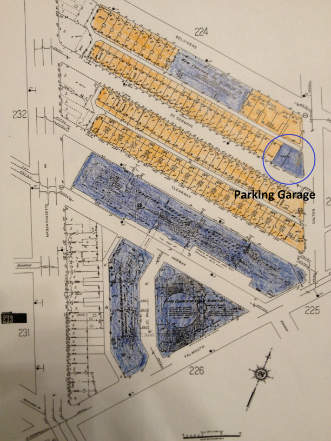 Although the site did not change much during the period of 1937-1951, some apartments in the northern part of the site were converted into a parking garage. This is another sign of the decreasing housing area and increasing institutional area trend. Not much else changed during this period. This could have been because there is no more room to expand and there is already a balance between housing, commercial, and institutional land.