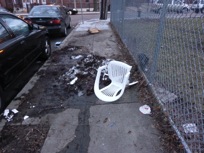 The Mary Ellen McCormack Project has rampant littering violators who are jeopardizing the cleanliness of the harbor and the nearby soil. I did not notice the trash problem during my first two visits because snow was still piled high on all the streets. During my most recent visit, I was shocked by the amount of trash. The most egregious violation of litter laws was a broken lawn chair left carelessly on the sidewalk (Figure 11).