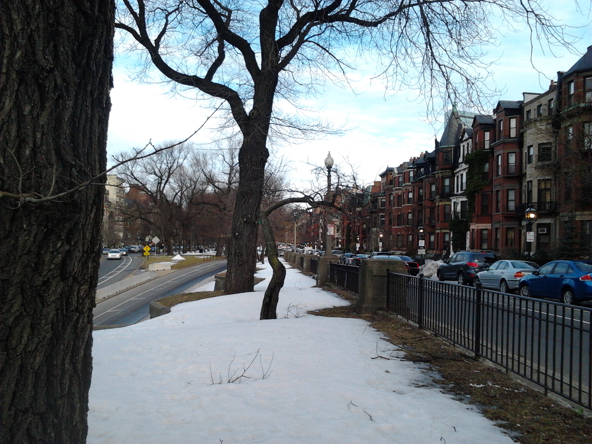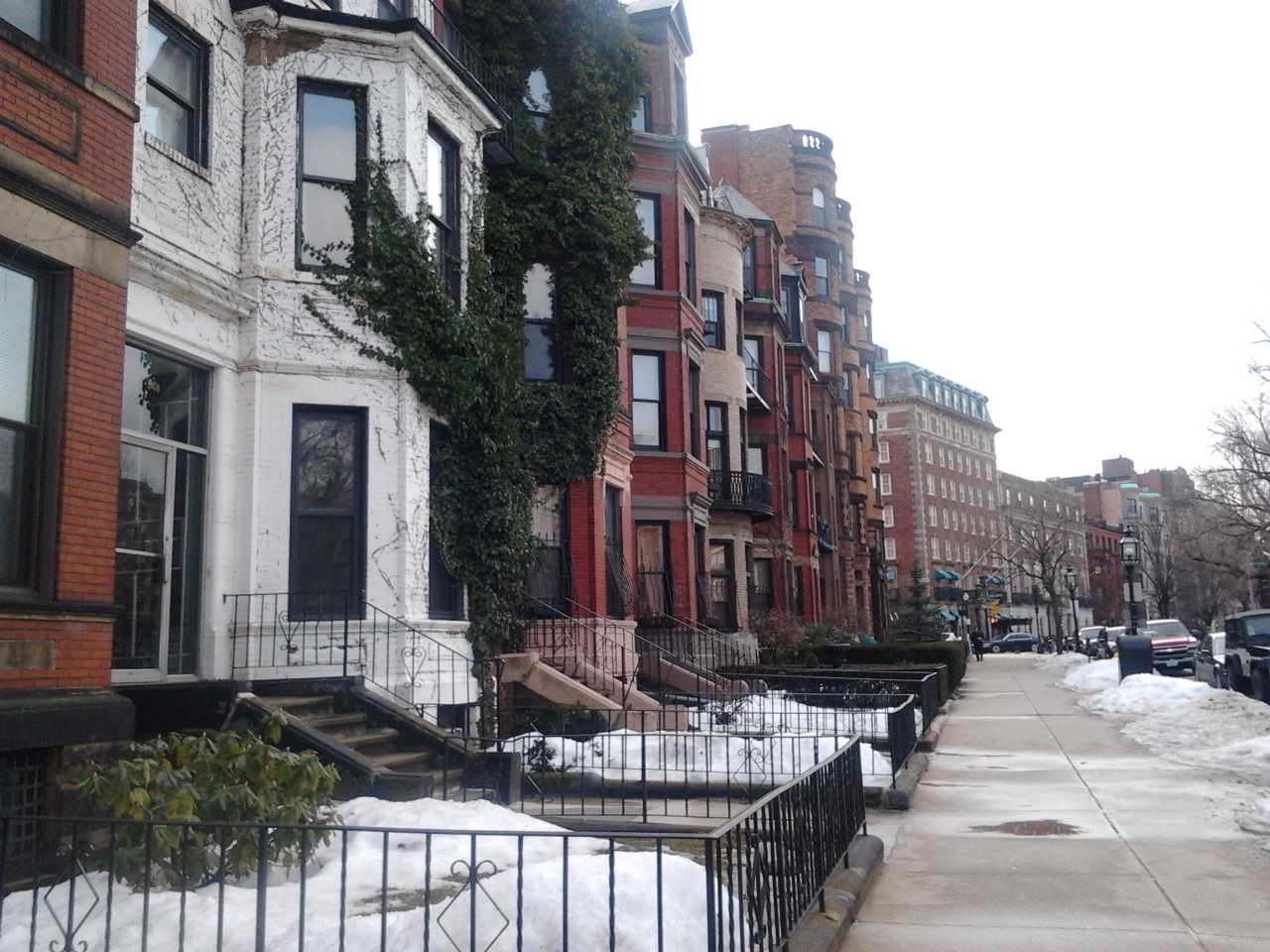 Because the sun naturally faces north, the south side currently has about a foot of snow on the sidewalks while the north side of Commonwealth Avenue measures to an inch. When looking for real estate on Commonwealth Avenue, one might notice that the prices of the north side houses and apartments are greater than those of the south side. This may be because is the sunlight provides better heating on the north side and people generally like the natural sunlight.