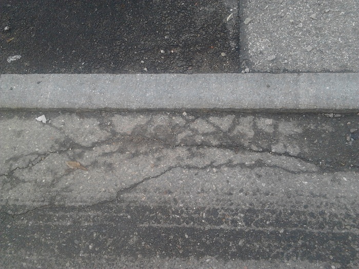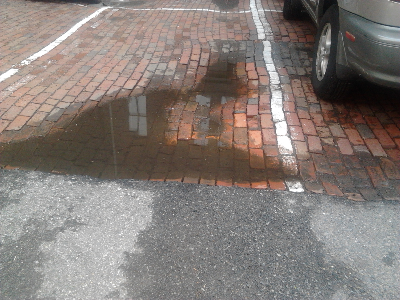A few parking spaces were covered in brick. Just by looking at Figure 7, it is not a particularly good idea to use brick as a way to pave the ground. A combination of the weight of the vehicles and improper drainage systems has made the brick dent, and water has started to pool and seep in the sand. In The Granite Garden, Spirn refers to this as swelling soil (Spirn 117). In a place like Boston where the ground is quite firm, swelling soil would not be a huge problem. But if this brick configuration was found in an area prone to earthquakes, i.e. California, this could lead to greater problems such as landslides (Spirn 115).