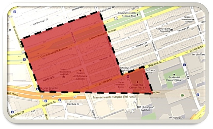 The site is bounded by Massachusetts Avenue, the Massachusetts Turnpike, Gloucester Street, and Boylston Street, featuring the Prudential Center. Many of my previous visits to this site have been due to the attractions of the famous Newbery Street and also the Prudential Center (Figure 2). But as I visited again for the reason of studying the site and looking for clues, I now have many questions that I’d like to answer over the next few weeks. In general, I would like to know how the historical, social, and economical events shaped my site into the diverse and popular area of Boston that it is today.