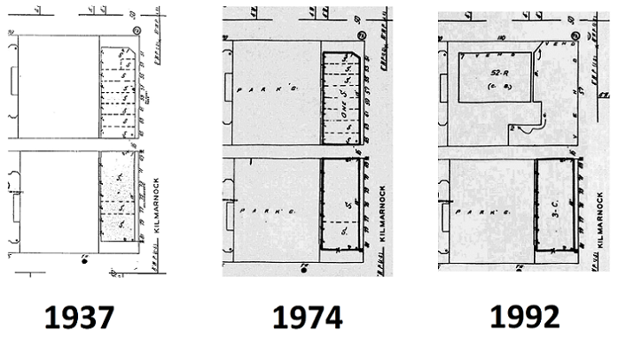 Figure 3 - A set of maps showing Kilmarnock Street in 1937, 1974, and
