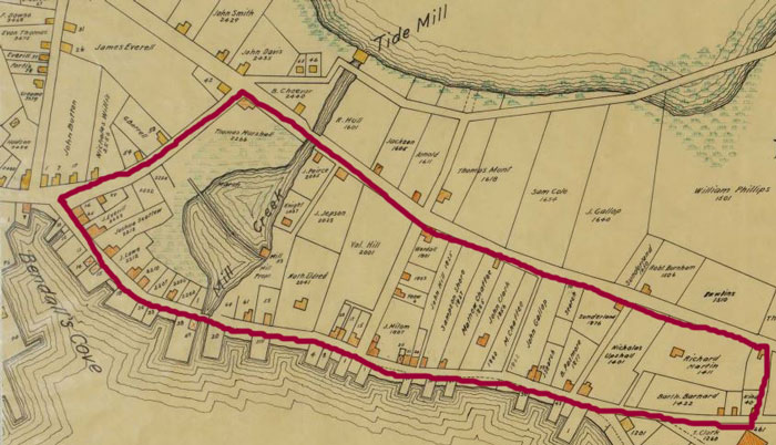 Figure 2.Map of the Town of Boston in 1648, showing how the North End was separated from mainland Boston by Mill Creek, a tidal creek connecting the Mill Pond to Bendall's Cove. Map from the Samuel Chester Clough research materials toward a topographical history of Boston.(April 1919) Massachusetts Historical Society, http://www.masshist.org/online/massmaps/. Modified by the author.