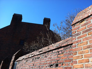 Figure 9. Trees can be seen over the top of the brick wall encapsulating Paul Revere's yard. Photograph by author. Given the proper conditions however, trees and plant life can be successful in the city. One example of this is the yard of the Paul Revere House. Although it was closed when I went, I was able to see the tips of many trees peeking out over the top of the brick wall surrounding the yard, as shown in Figure 9. My assumption is that the yard has been preserved along with the house, and can provide enough space and sunlight to the trees for them to be able to survive and prosper. I am concerned for their future though, since part of the Big Dig involved tunneling under that area, which may force a constraint on the growth of the tree roots. Another place where plant life has the opportunity to thrive is on the Greenway. This relatively new area was designed specifically to foster plant life, and while it still has the constraint of being built over a network of interstate highway tunnels, it also has abundant sunlight and a large horizontal area, which should provide the roots with some room to expand. While the Greenway may not be returning the area to the true wilderness of centuries past, the addition of a green space and plant life should have positive effects on the many natural processes of the area surrounding it, such as water drainage and air pollution.