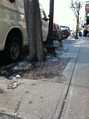 Figure 7. A line of bricks that has been forced up by underground structures. Photograph by author. Roads and pathways can be affected by means other than water, however. When I first noticed the ridge of bricks sticking up on the sidewalk along North Street, as can be seen in Figure 7, I thought it may have to do with the road settling and causing the whole sidewalk to slant downwards. I knew the area had recently undergone a large amount of construction due to the Big Dig, and reasoned that the soil was still in the process of compacting and settling. After discussions in class though, I realized that the bump in the sidewalk was not due to the settling of land, but due to one of the supports for the highway tunnels constructed during the Big Dig. The interstate highway runs right underneath the Greenway, and since the ridge of bricks is so precisely linear it is reasonable to assume that it was formed due to one of the tunnel’s support beams. In contrast, sometimes the rationale for why bricks or sidewalks are moved the way they are is immediately apparent. This tree in the North End, for example, is obviously pushing the bricks up and apart as it grows too large for the small container it has been placed in.