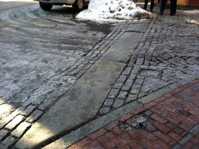 Figure 1. The boundary between Union Street and Marshall Street. Photograph by author. While standing at the corner of Hanover Street and Congress Street, the first thing I notice is the huge lettering on the brick building across from me. Bell in Hand, A.D. 1795. As I walk past a placard explaining the “Bell’s” journey and naming it the oldest tavern in the US, I notice more taverns proclaiming their history on large signs. Ye olde Union Oyster House, est. 1826. Green Dragon Tavern, “Headquarters of the Revolution”, 1773/1776. These places may be historical artifacts, yet they are still very much alive and a part of the city’s culture. Even as I watch, a large group of uniformed men and their well-dressed spouses and families flows out of the Union Oyster House, presumably coming from a function of some sort that had just ended. I look down a small alleyway next to the restaurant, and note how the street changes from pavement to cobblestone, creating a physical line between the old and the new.