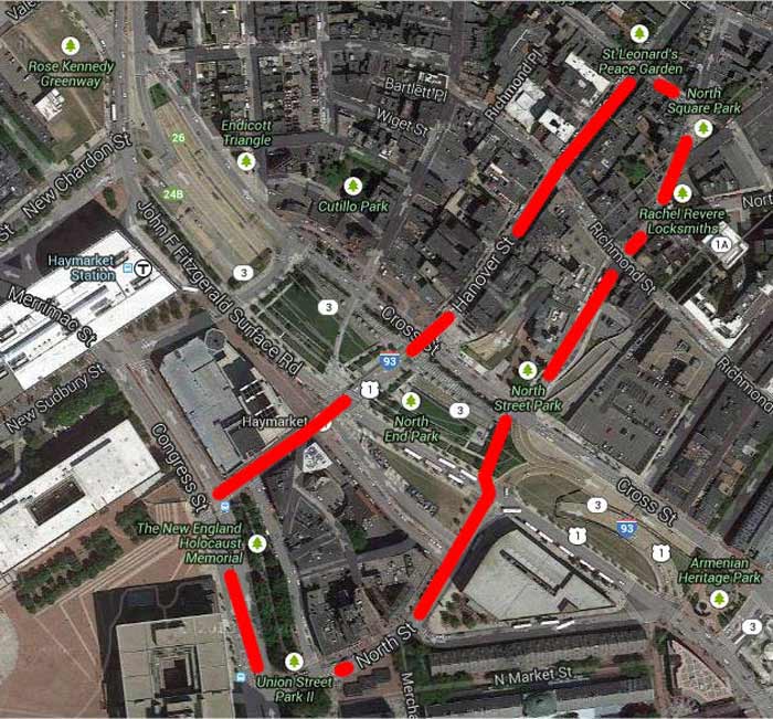 My site was chosen specifically to examine this juxtaposition of the historic and the modern, and see the different ways in which historical sites in Boston have managed to adapt to the 21st century. The area I am studying extends from the New England Holocaust Memorial to the Paul Revere House, and includes Haymarket, the Greenway, the Sumner Tunnel, parts of the North End, and all the Union Street historical taverns, as mentioned previously. A map of the area can be seen below.
