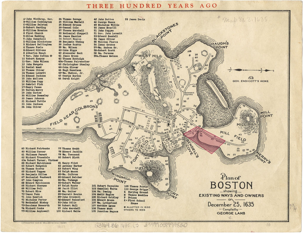 Figure 1. In 1635 my site was mostly underwater, with only Hanover Street and Union Street already in place. The land was mostly undeveloped at this point. Map from Norman B. Levanthal Map Center at the Boston Public Library (1903) http://maps.bpl.org/id/10923. Modified by Author.
