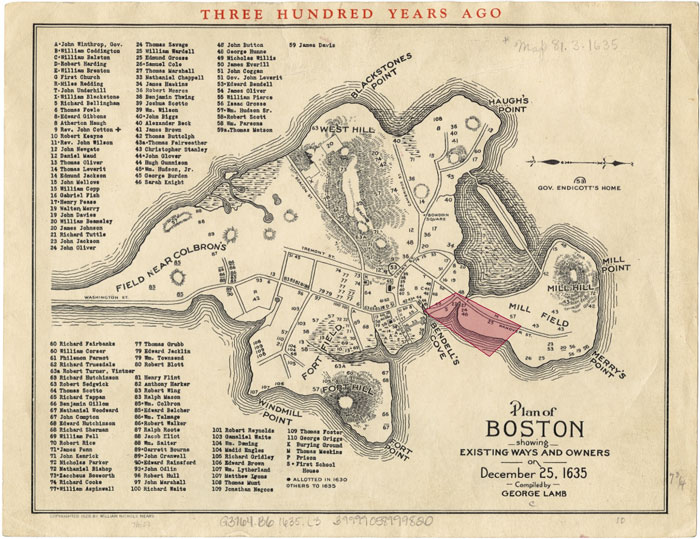 By 1722, part of Mill Pond and part of Bendell’s Cove had been filled in, and my site took the approximate shape and street layout that it has today. There was an enormous increase in the number of buildings and streets in the area between 1635 and 1722, demonstrating just how quickly the population grew. The bodies of water were probably filled in for exactly this reason: to provide more space for an expanding population. By 1740, the population of Boston was 17,000, up from 7,000 in 1690, which made it the largest city of the American colonies. [1]
