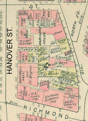 Figure 2. A close up view of one of the blocks of my site from 1883. Notice how there are only a few distinctly Irish names showing up, such as Annie Doherty in the bottom right corner. Also notice that at this point the Paul Revere House (yellow with “438” on it) is simply a privately owned home. Map from Atlas of the City of Boston, from Actual Surveys and Official Records; City Proper, Volume 1 (G.W. Bromley & Co., 1883) MIT Library Dome Collection, http://hdl.handle.net/1721.3/48709. Modified by Author. However, when looking at a map of landowners from the late 1800s it is not immediately clear that the area was heavily populated with Irish immigrants. There are only a few Irish surnames, such as Doherty and Finnegan, interspersed between an overwhelming majority of English names like Robbins, Davis, and Leeds [4]. This lack of distinctive ethnic names is due to a lag effect, in which it takes many years for new immigrant groups to build up enough wealth to become landowners instead of simply renting space in a particular area. By 1902 the North End began to be populated with other names like Silverman, Scigliano, and Tossinari, hinting at the Jewish and Italian groups that had also settled there. [5] The Italian influence can also be seen in the name change of a hotel between the 1895 and 1909 Sanborn maps of my site: what used to be “Hotel Ludwig” became the very Italian “Hotel Venice”.