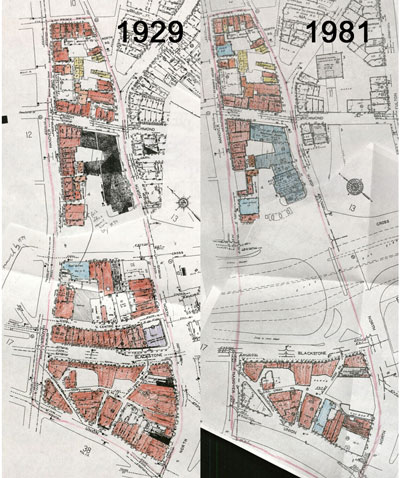 Figure 4. Maps showing the changes that occurred due to the Interstate Highway Act. While most of the services in the block that was demolished were simply lost, it is of note that the post office simply moved to the space at the bottom left of the Sumner Tunnel entrance. There is still a post office there today. Maps from Sanborn Fire Insurance Maps from 1929 and 1981. Modified by Author.