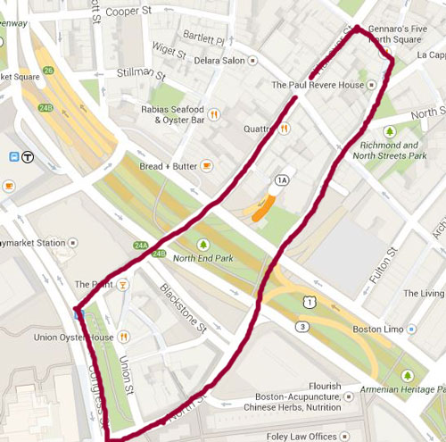 Figure 5. My site today is segmented into three parts, but unlike in the days of the elevated Central Artery, now it is actually possible to walk from one end to the other. Although the two ends of my site are relatively similar to how they were in the past, my site has gone through many changes over the years. Imagery ©2014 Google, Sanborn. Modified by the author.