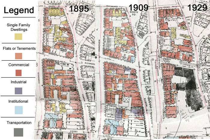 The rise and fall of the tenements can also attest to the changing population and influx of immigrants between 1895 and 1929. These cheap living quarters provided housing for countless immigrants and the poor during the early 1900s. Looking specifically at the North End section of my site, in the area bounded by Cross Street, Hanover Street, Prince Street, and North Street, the types of living spaces available changed drastically over the course of 35 years, as can be seen in the maps below.