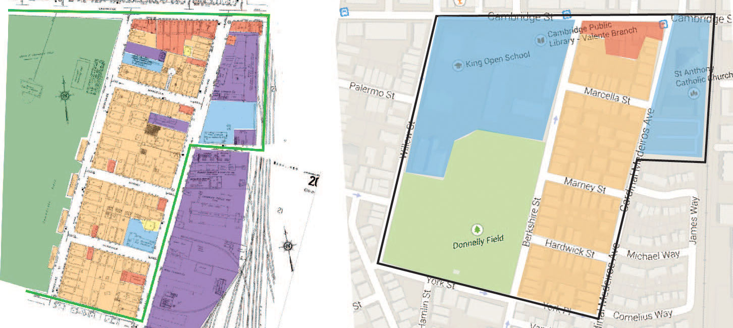 Figure 3:Very few of the buildings in the residential section between Cardinal Medeiros Ave and Berkshire Street have changed since the 1934 Sanborn map on the right when compared to the Google Maps 2015 image on the left. The few stores that were not along Cambridge Street have been converted into just residential buildings, St. Anthony’s Church has moved and the few “industrial” plots have been absorbed by the residences around them.