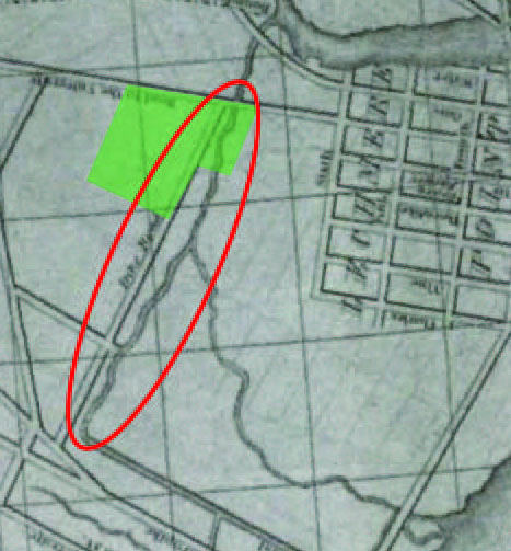 Figure 1: Portland Street, Dike Road on this map by Nathaniel Dearborn, used to run parallel to the canal that connected the area to the Charles River. This alignment is different from the grid system used by East Cambridge in the right side of this map.