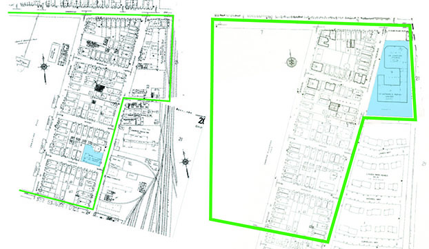 Figure 4: The Sanborn 1934 map on the left shows the original location of St. Anthony’s Church. In the 1996 Sanborn map on the right, the new location is shown. Only two blocks up from the original location, the church was able to expand to about four times its original size.