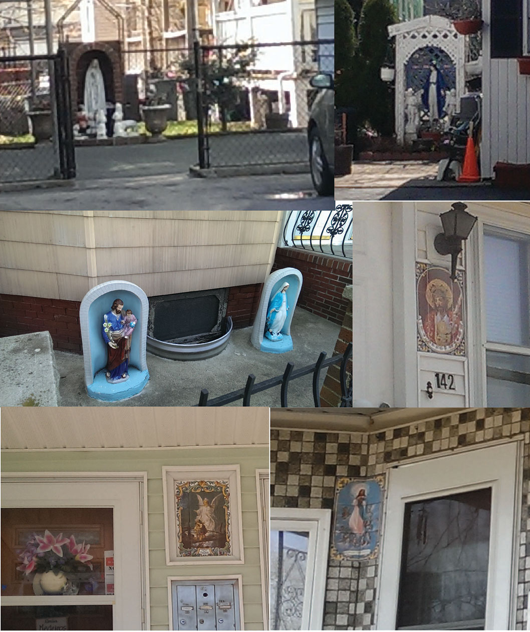 Figure 5: These photographs were taken of various houses in the site. Pictured are three of the shrines found and three of the religious tile paintings seen near various building doors. These findings support the idea that this neighborhood has a strong Catholic influence.