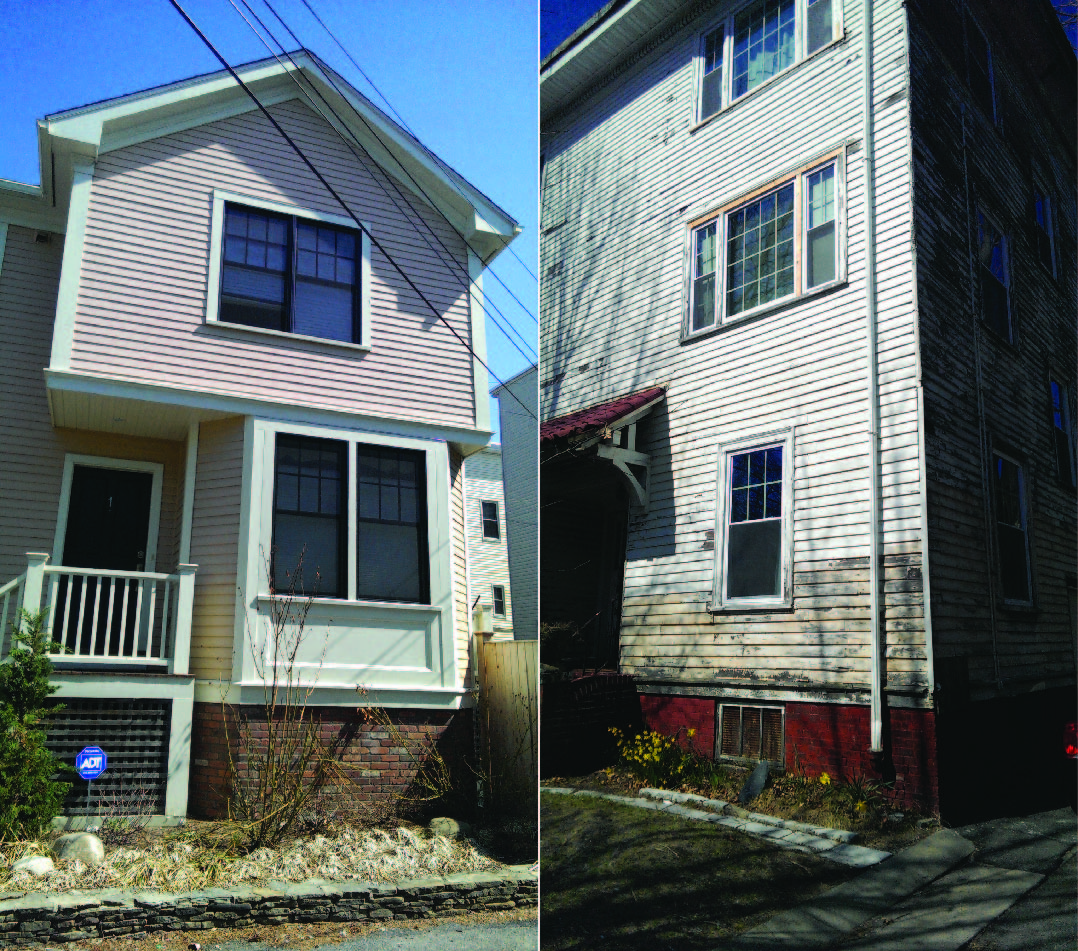 Figure 8: The house on the left has new siding, a nice stone wall and landscaping. The house on the right badly needs new paint and/or siding, barely has a path to the front door, and has an overgrown garden. These contrasting houses demonstrate the mixture of the older buildings in slight disrepair with the newly renovated buildings on the site.
