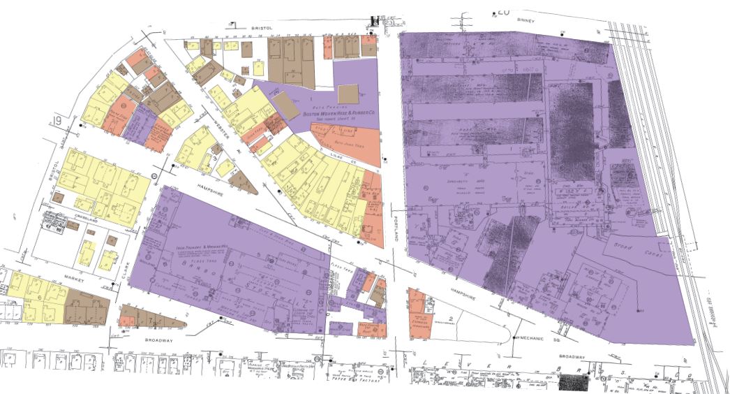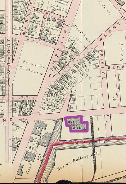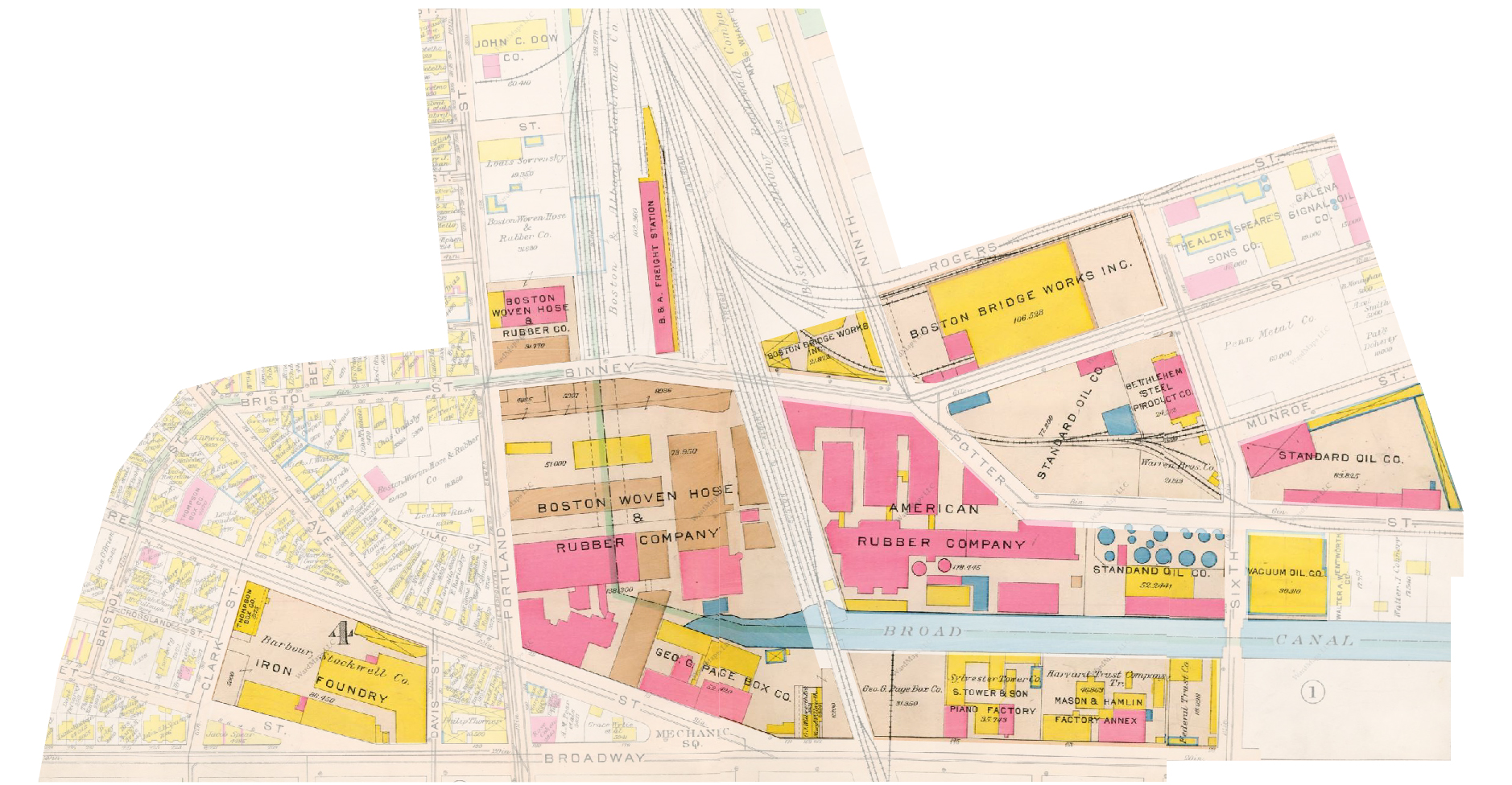The first historical layer takes shape through the establishment of infrastructure on and around the site, and the implications associated with it. Specifically, the Broad Canal extends into my site, ending at the modern-day Cardinal Medieros Street. Here, the presence of the “Boston Rolling Mill” can be seen.