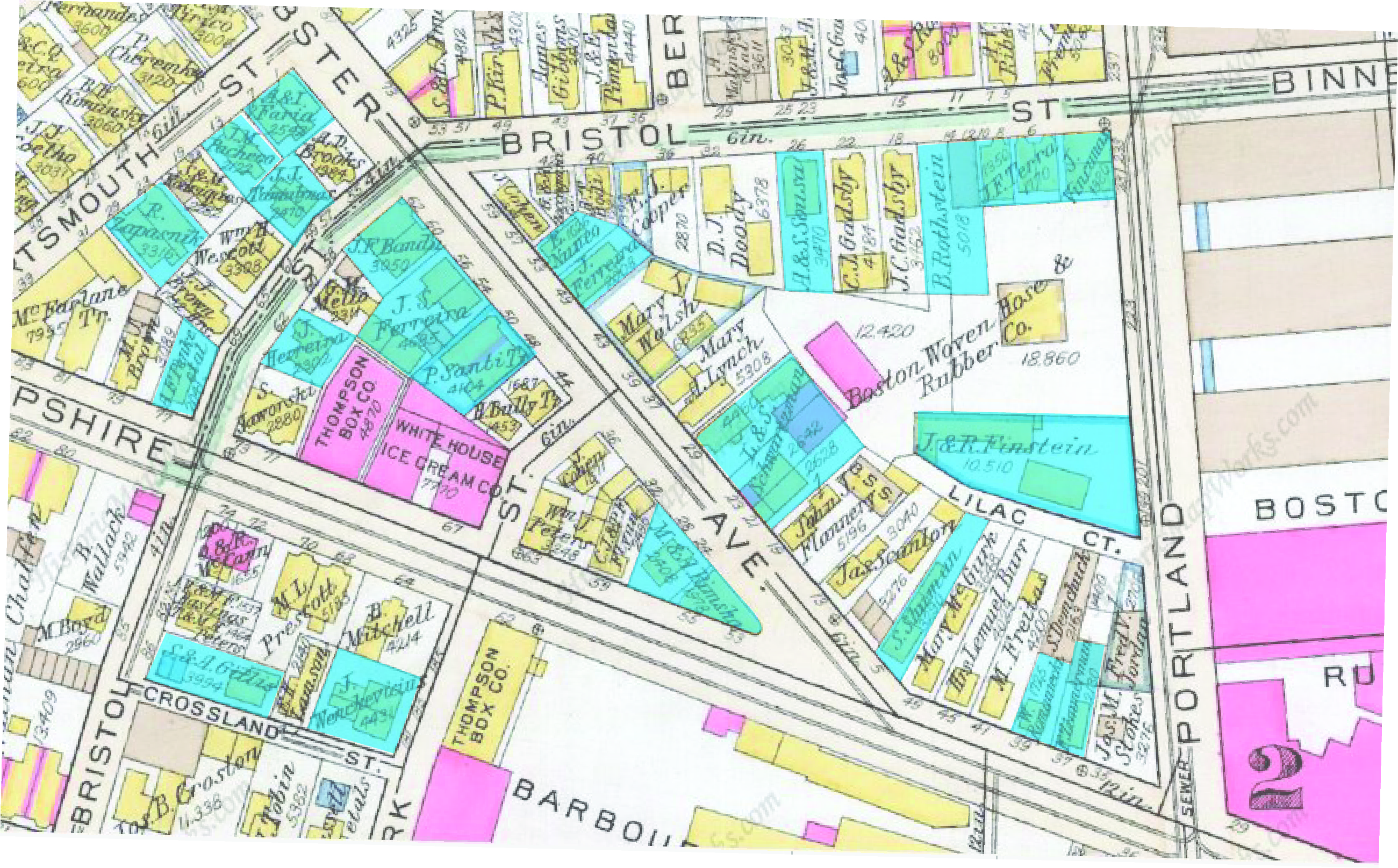 The placement of the shops also seems to begin a division of the industrial and residential areas, becoming a sort of intermediate zone between the two. What seems even more significant is the establishment of both auto junkyards and a garage. This seems to signify two things in addition to the growing usage of the automobile; firstly, people are consuming vehicles at a rate that requires replacement. Secondly, the garage implies transportation from beyond the local area. As noted in Crabgrass Frontier, “They [trucks] were not generally available until 1909, but their impact was quick. K.H. Schaeffer and Elliott D. Sclar have calculated that manufacturing employment in Boston’s inner ring (defined as communities from two to six mile from the Boston Common) grew much faster than those either closer in or farther out between 1909 and 1919” (Jackson, 184). This suggests that the trucking industry has a major impact on the development of the site. The map also states that the garage was capable of holding 10 trucks, most likely suggesting that the movement of goods in and out of the industrial sector now included vehicles.